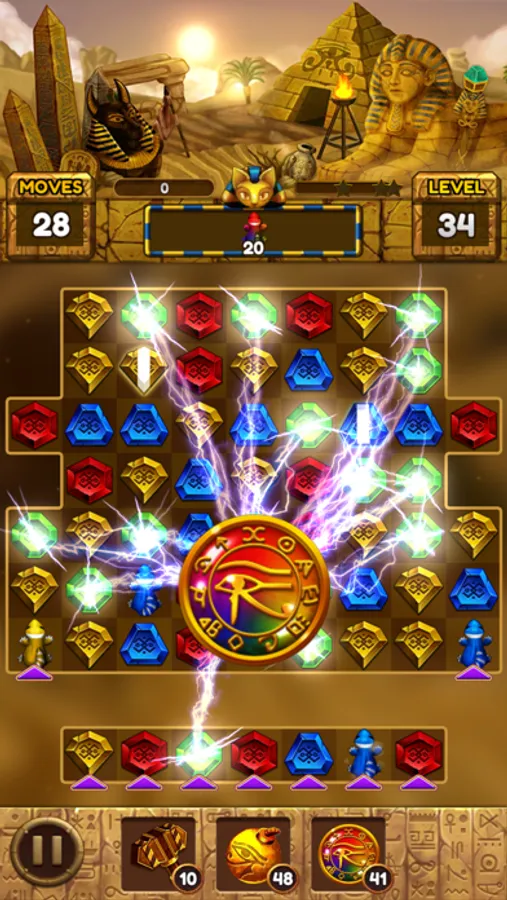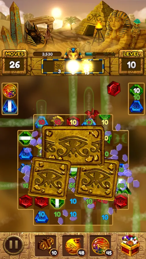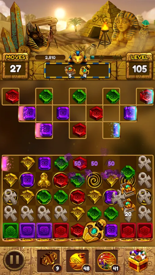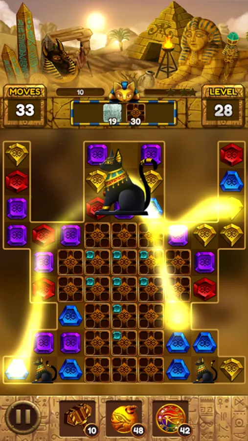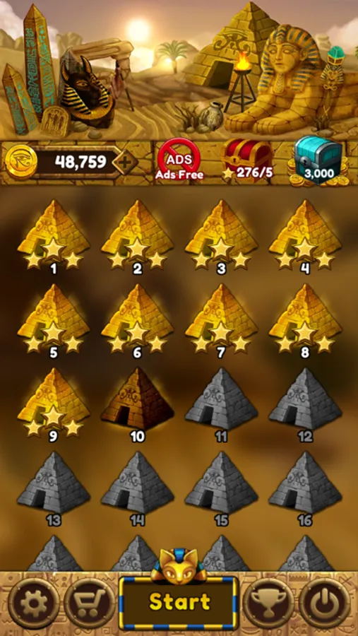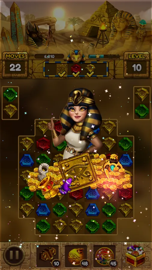 There are tons of beautiful gems and mysterious jewels at Pharaoh's secret places. It's time for you to go on a quest to find hidden treasures in the ancient Pyramid with various missions. It's a classic brain game and brings you fun relaxation.