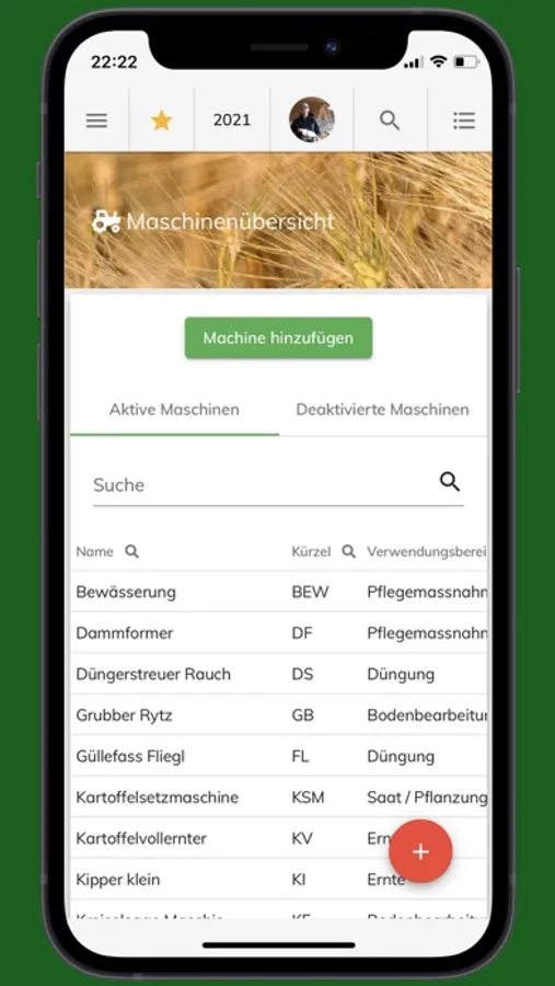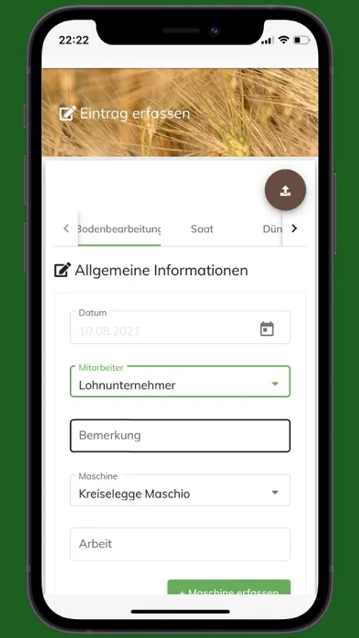 Das Herzstück der Applikation sind die Kulturenblätter. Für jede Kultur wird ein Kulturblatt generiert, in welches analog dem Feldkalender in Papierform Einträge gemacht werden. Dank den vorerfassten Daten wie Maschinen, Produkten, Mitarbeitern, etc. ist die Eintragserfassung ein Kinderspiel und innert kürzester Zeit erledigt. Egal ob am PC oder gleich während der Arbeit über das Smartphone.
