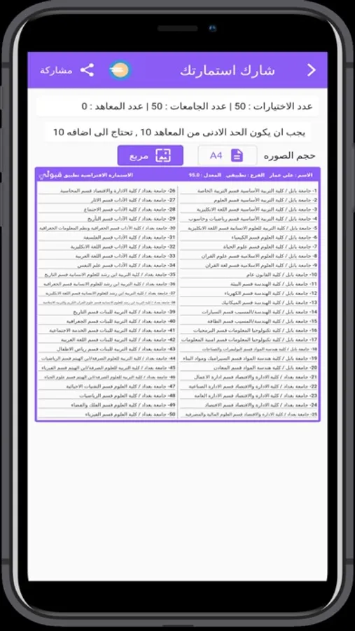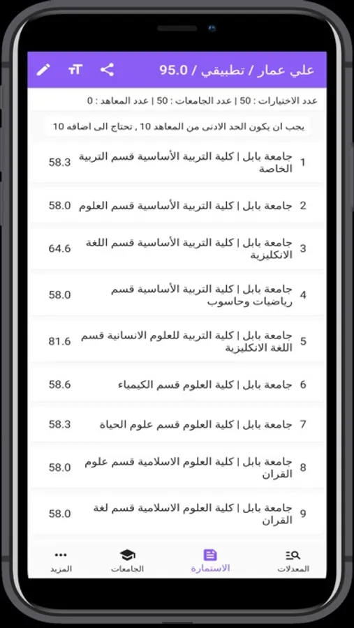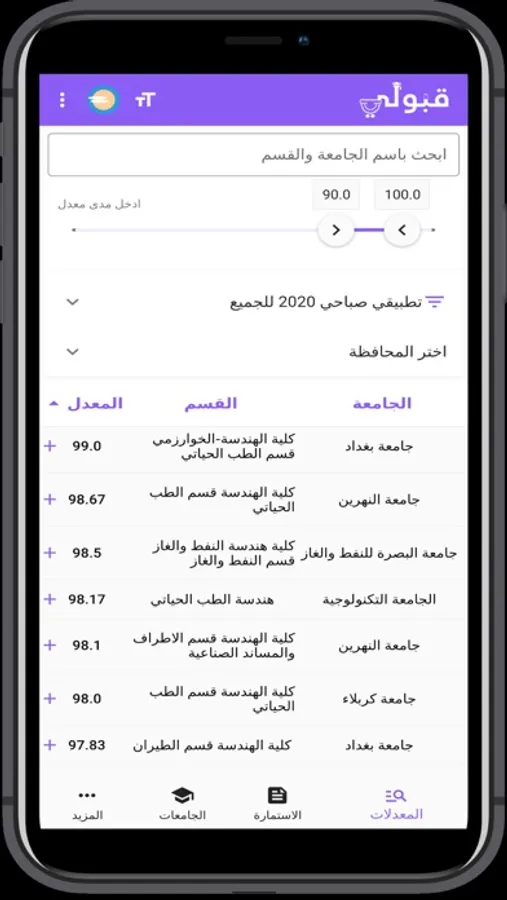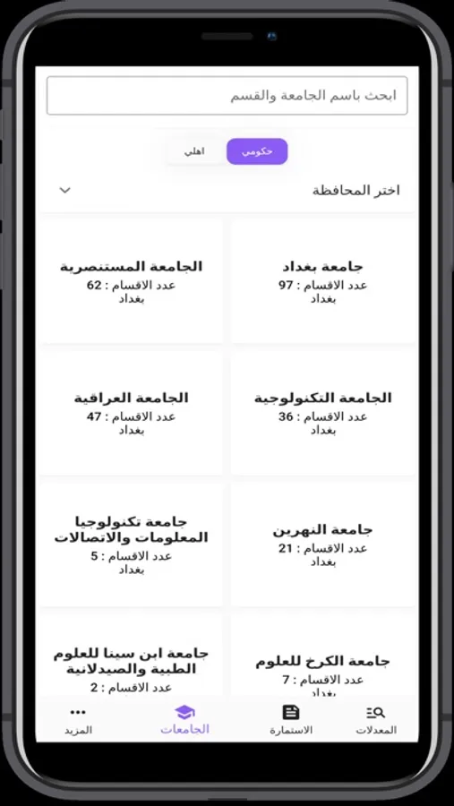 الجامعات : استعرض الجامعات العراقية واقسامها ومعدلاتها من خلال التطبيق