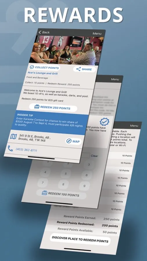 Once you collect enough points, those points can be redeemed for goods or services at Experience Brooks-Newell Rewards locations, which are indicated in the app. Select the place where you would like to redeem your reward. Hitting the “Redeem Rewards” button while physically at a Rewards location will bring up a key pad for the place owner to enter a code to deduct points from your point total in exchange for your reward. You must have an internet connection in order to redeem points.