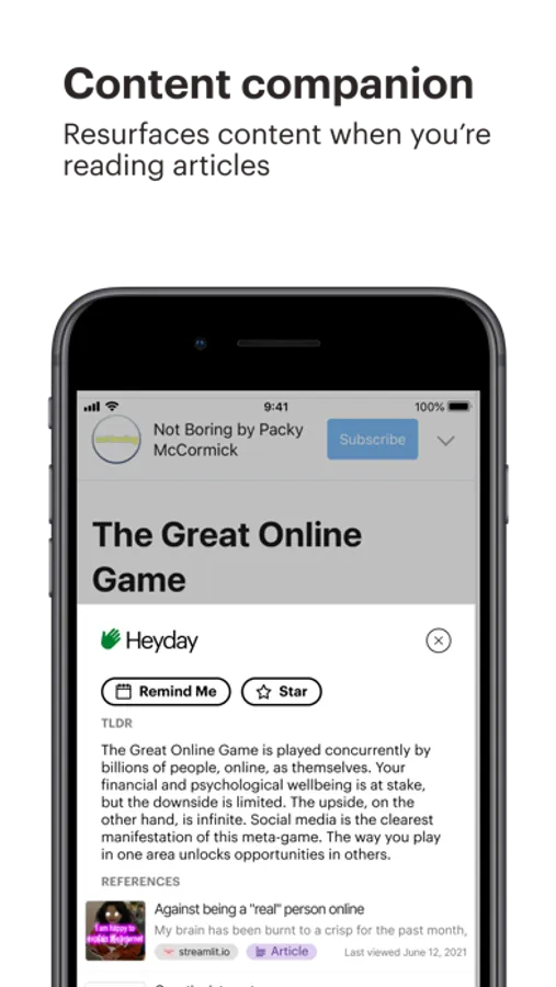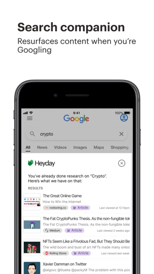 Heyday automatically saves your research, and resurfaces it when you're browsing and reading online.