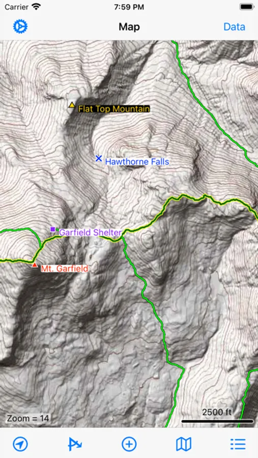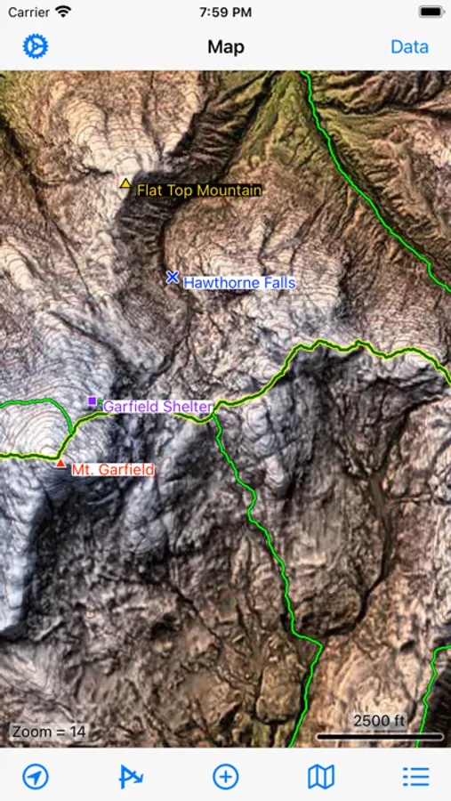 • A builtin database of many hundreds of geographic points, summits, huts and shelters, natural features of interest, and other points of interest (POIs). All major summits have been located using the highest elevation in the DEM.