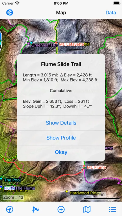 • Custom hikes can combine segments of several different existing trails and you still get all the data on slope, elevation gain, etc. that you could want.