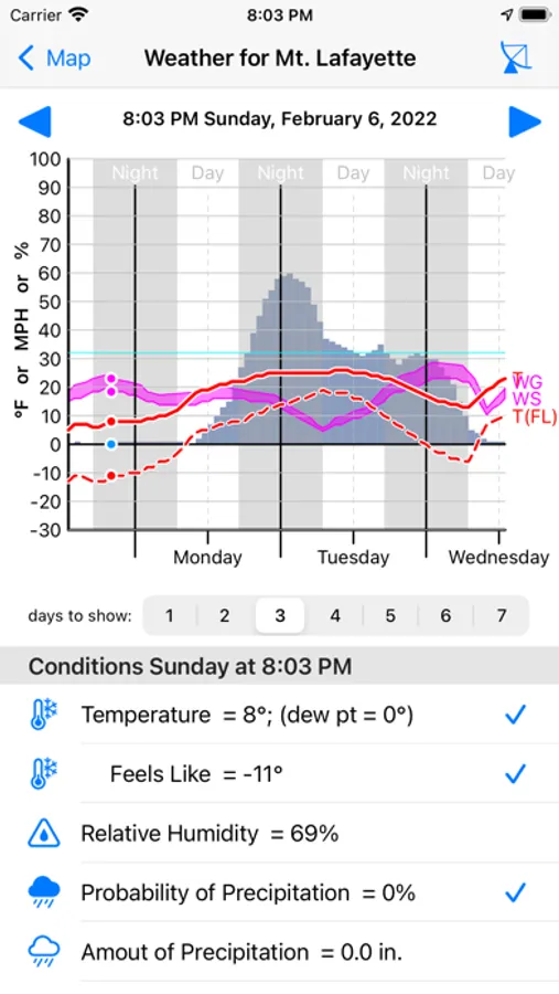 • Weather forecasts from the National Weather Service (NWS) — with hourly conditions for the next seven days — for any POI. Want to see how hard the wind is blowing on top of Mt. Washington? Sure! This feature requires an internet connection.