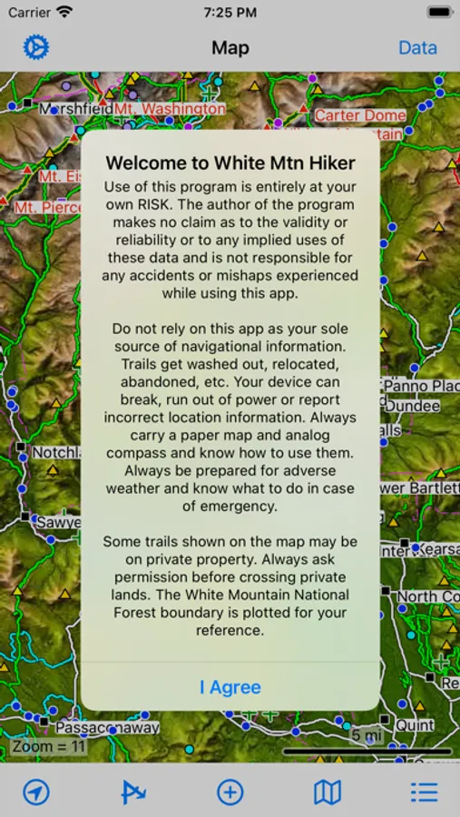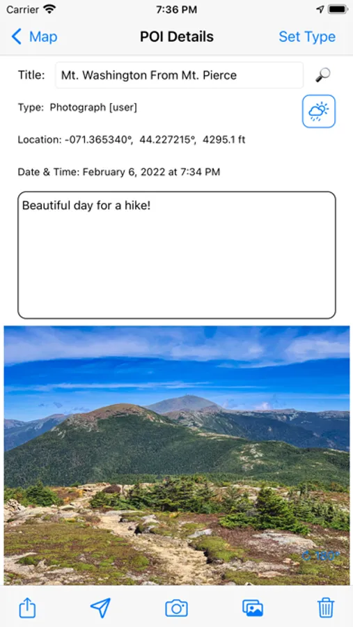 • Set your own POIs and attach photos to them or take new photos without leaving the app. Photos can be annotated. User POIs can be emailed to anyone the user likes. Do not rely on this as a safety feature as it only works when you have a cellular data connection and there are many parts of the White Mountains without reliable cell service!