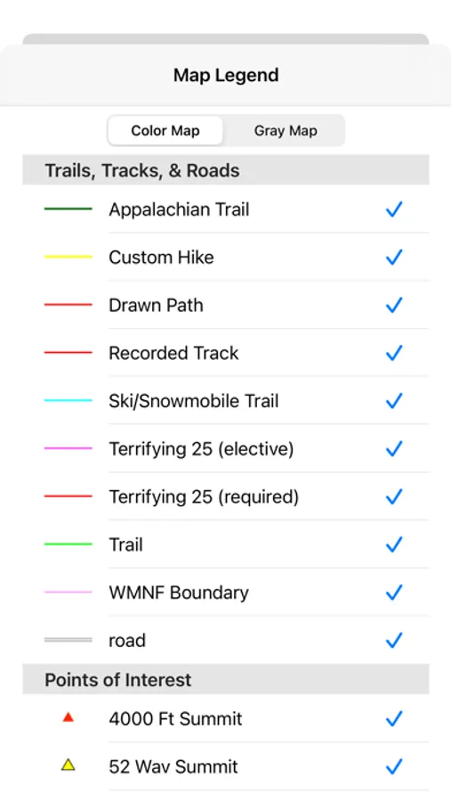 • A builtin Apple Maps screen displays all of the trails and POIs on a satellite, hybrid, or road map.