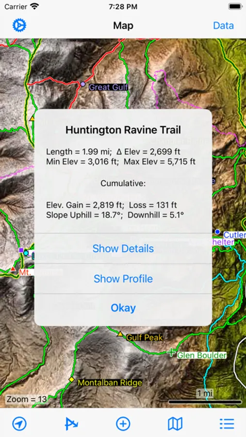 • Custom hikes can combine segments of several different existing trails and you still get all the data on slope, elevation gain, etc. that you could want.