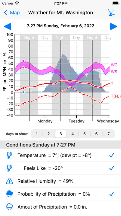 • Weather forecasts from the National Weather Service (NWS) — with hourly conditions for the next seven days — for any POI. Want to see how hard the wind is blowing on top of Mt. Washington? Sure! This feature requires an internet connection.