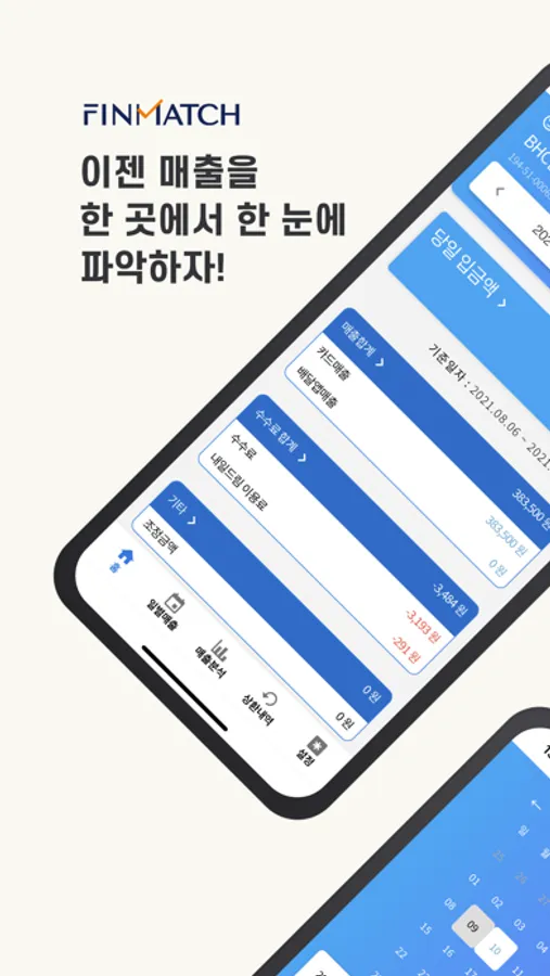 핀매치는 대한민국 중소상공인들의 상생서비스로 카드매출과 배달앱매출을 한 곳에서 파악하기 쉽도록 서비스를 제공합니다.