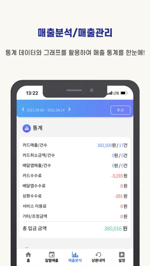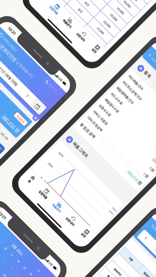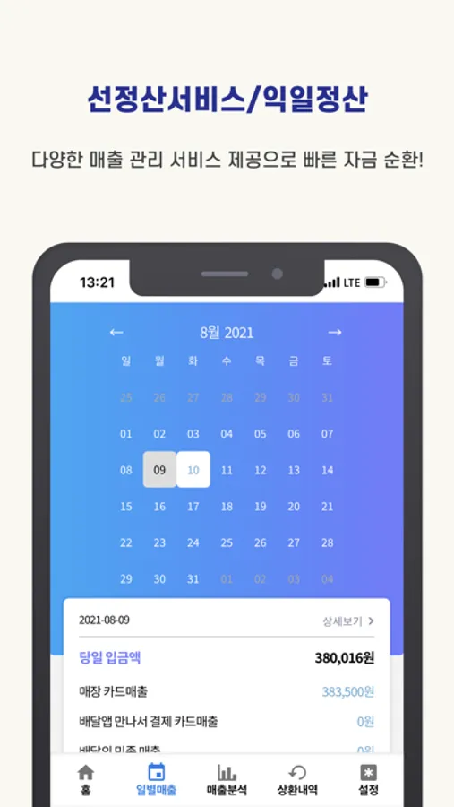 단순히 매출액만 보여주는 것이 아니라 상세내역까지 모두 제공하여 데이터의 신뢰성을 높이고, 매출그래프를 통해 매출상승전략에 도움을 드립니다. 특히 사장님들의 현금유동성을 높이기 위해 오늘의 카드 및 배달앱매출을 내일 입금하는 선정산서비스(유료)도 제공합니다