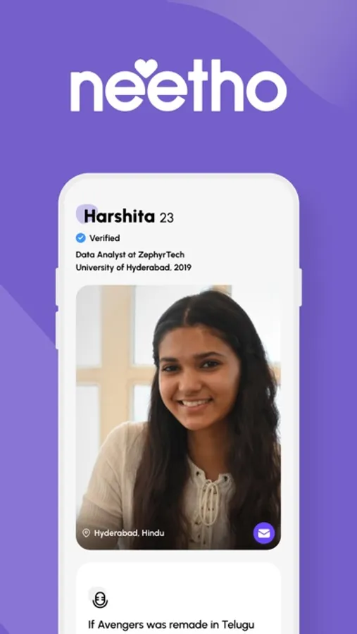 Neetho is India’s first vernacular dating app that is designed to bring Telugu residing in and outside India closer for one common reason — finding long-lasting relationships. The word 'neetho' translates to 'with you' in Telugu. So, the app is designed to offer high-intent dating experience that is culturally aligned with Telugu needs. Neetho's unique approach to appreciating sensitivities has made it one of the fastest-growing vernacular apps; and as we see it, Neetho is soon going to replace the need for matrimonial platforms out there for the Telugu community.