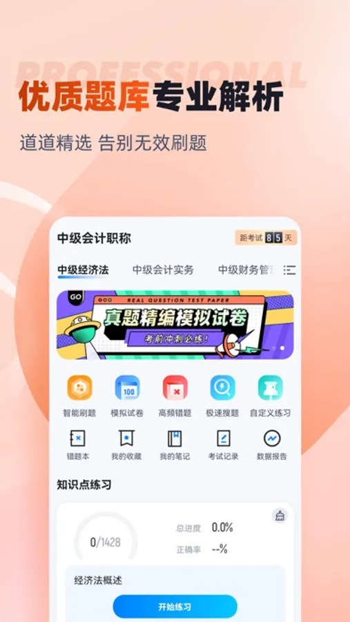 中级会计题库内含考点练习,全国通用卷以及地区卷模拟练习,以及按照固定考试比重的随机式的抽题的真题考场,成绩单实时记录考试数据,一点一滴的反馈考生近期学习状态以及自我正确率的提升,大大的给予考生通过考试的信心。