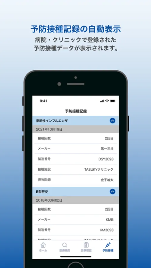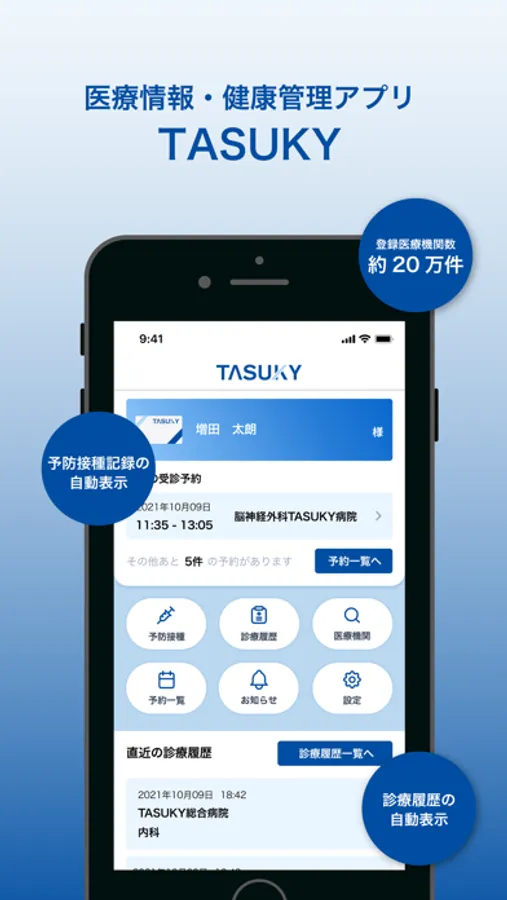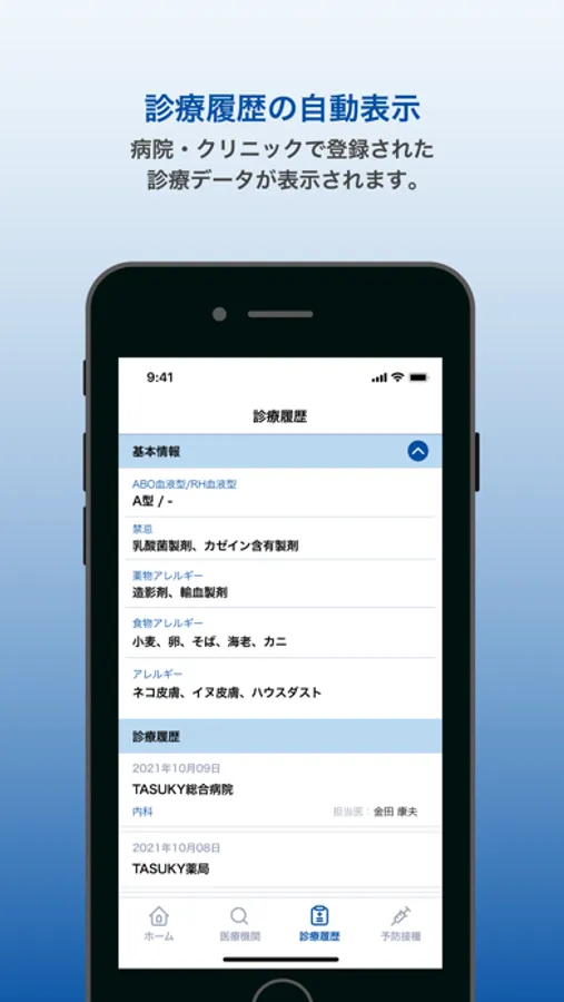 「TASUKY」を導入している医療機関(病院、クリニック)での受診データが自動的に反映されます。