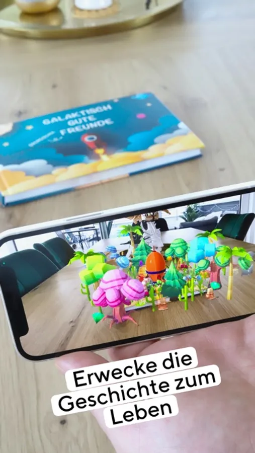 Erwecke die Story im galaktischen Freundschaftsbuch zum Leben! Lade die App herunter und fokussiere das Cover des SmileMyLove Freundschaftsbuches.
