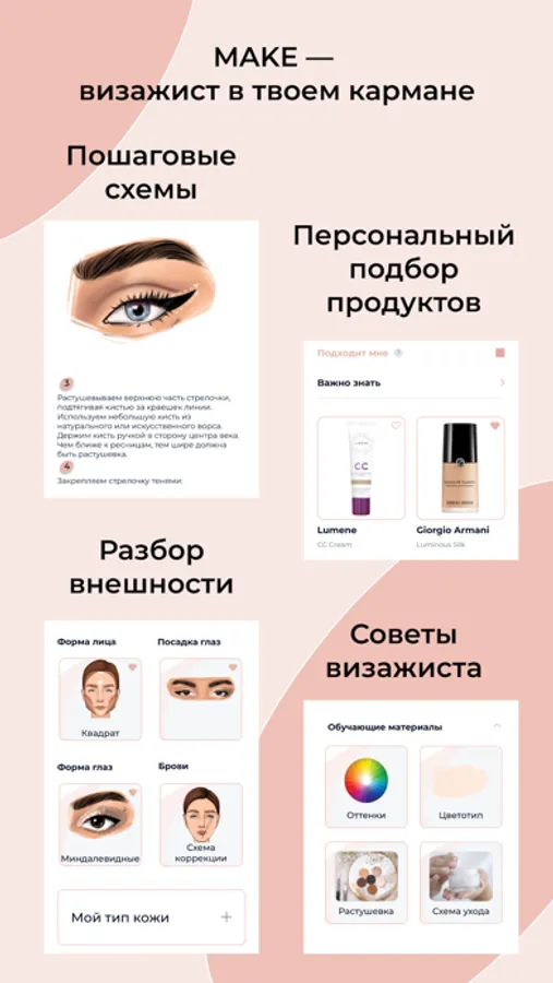 - MAKE подберет косметику по результатам тестов на цветотип и тип кожи.