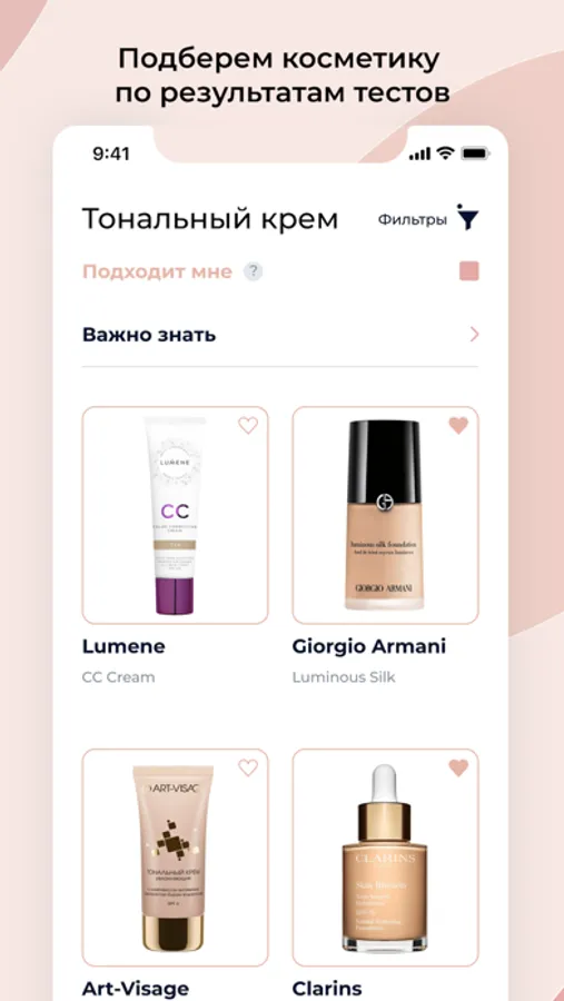 MAKE позволяет сделать выбор косметики по фильтрам. Пройди тесты на цветотип и тип кожи, чтобы MAKE использовал результаты тестов в подборе косметики.