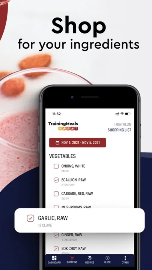 You picked your meal plan; we put together a shopping list with all ingredients you need. Uncheck every item you already have at home. Then order your ingredients from our retail partners. Follow our easy recipes and enjoy gourmet meals that help you recover better and improve your performance.