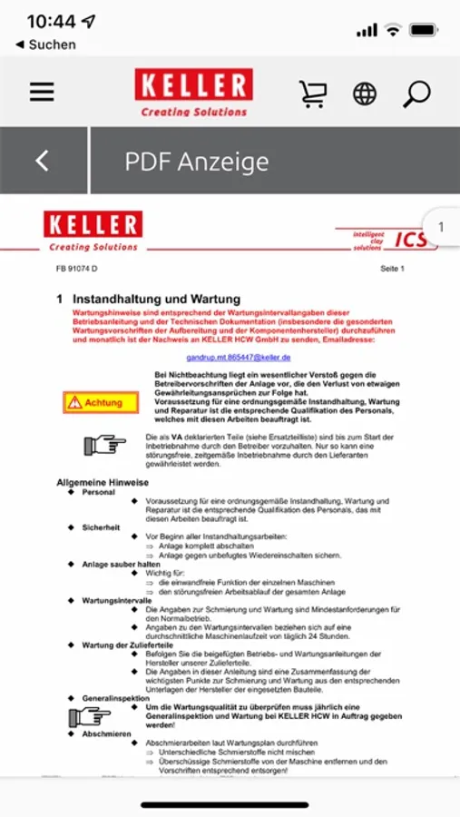 Customer service has never been faster and easier. With our service app, you have quick and easy access to your individual machine and plant documentation, the possibility to call up service information, request spare parts, communicate comfortably with us and exchange documents at any time and from any place via your tablet or smartphone. To do this, use the new Service App of KELLER HCW. This is service in completely new dimensions.