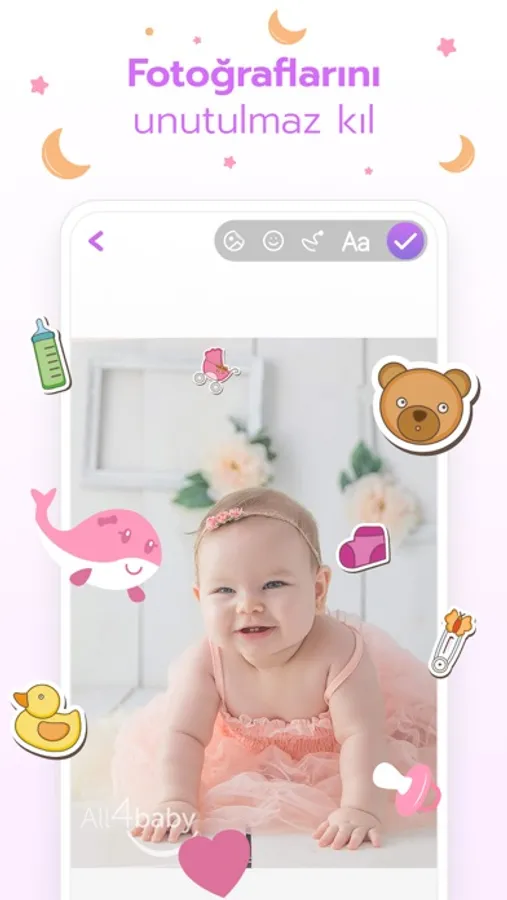 Hamilelik ve sonrasında anne bebek arasında kurulan mucizevi ilişkideki tüm süreçlerin takibini yapan bir yardımcıya ne dersiniz? Hamile kaldığınız süreden itibaren hafta hafta gebelik takibi ile başlayan bu serüvende All4Baby sizin en büyük yardımcınız. Hamilelik ve doğum sonrasında da bebek gelişimi ve çocuğunuzun büyümesine kadar yanınızda olacak harika bir dijital yardımcı olan All4Baby annelik yolculuğunuzda her zaman yanınızda!