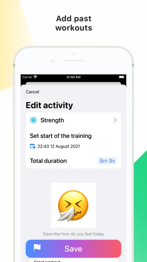 You can enter a missed workout in a special section using the desired type, start date and duration.