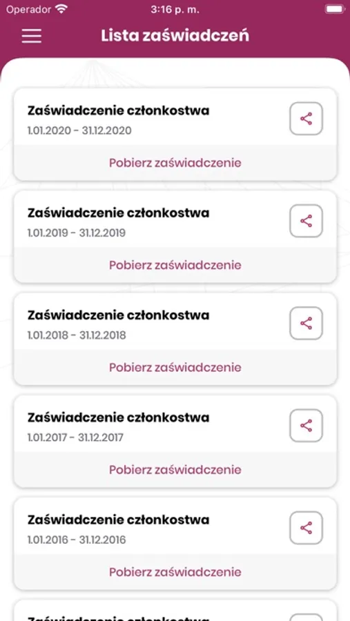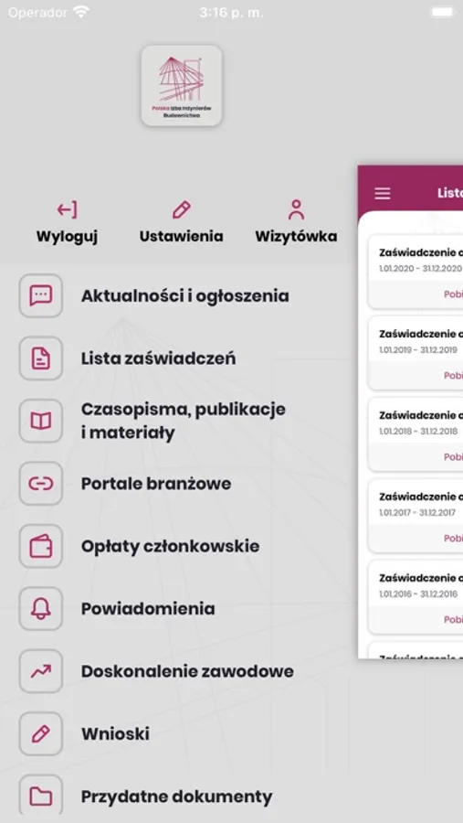 Lista zaświadczeń - możliwość pobrania zaświadczeń potwierdzających członkostwo w Izbie.
