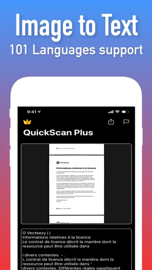 L'application prend en charge la technologie de reconnaissance optique de caractères (OCR) et vous permet d'extraire le texte de l'image. Il ne nécessite pas de connexion Internet, car toutes les analyses sont stockées localement sur votre appareil.