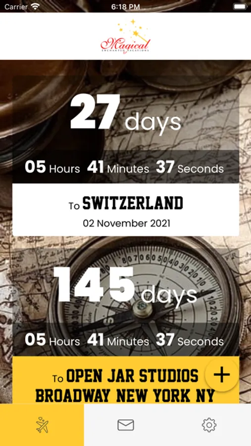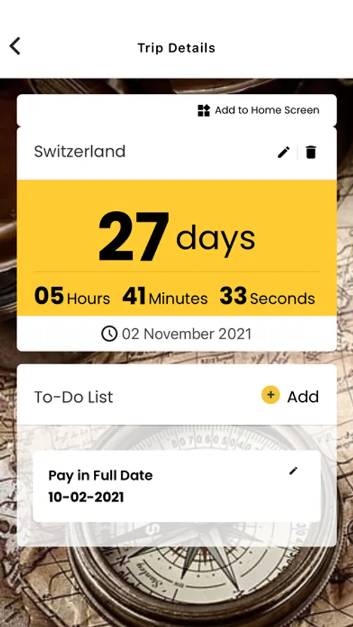 Vacation Planner Countdown provides an on-screen, background customizable, countdown for an endless amount of upcoming vacations! Additional features include personalizing a to-do list that sends notifications which include adding a final payment date, rental car/airline book by date, when to pack, and more!