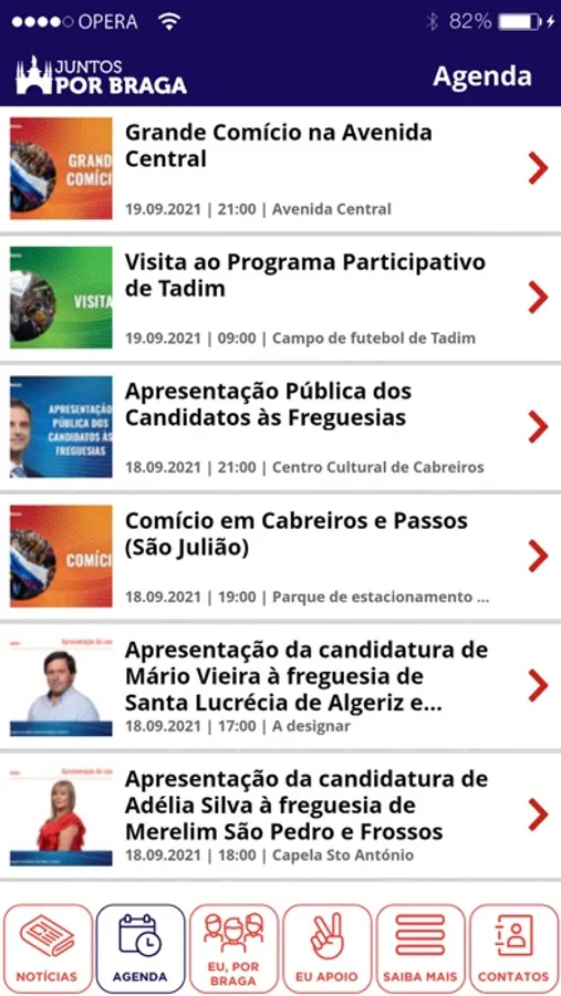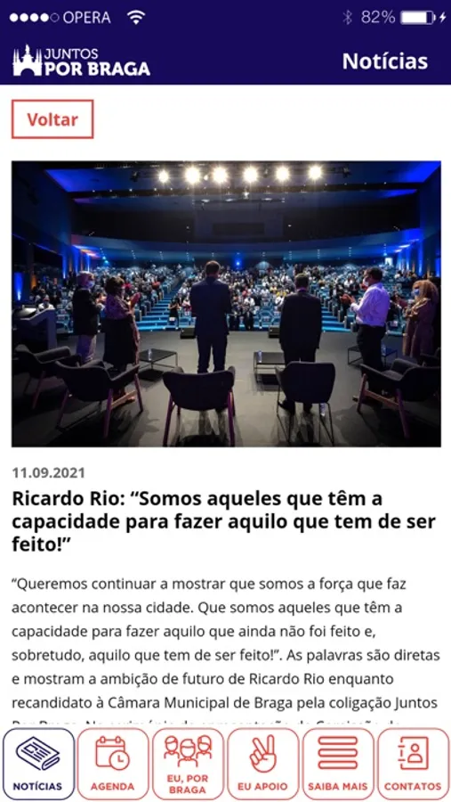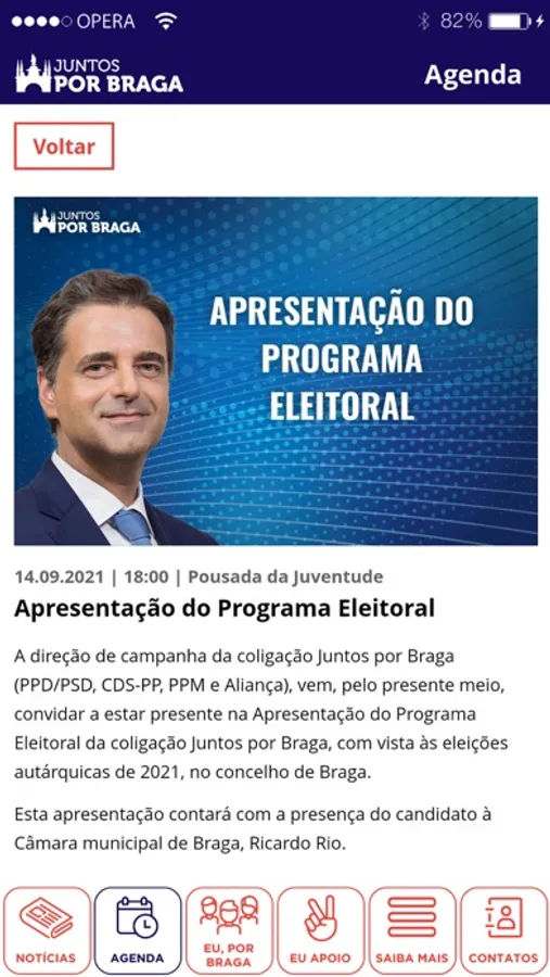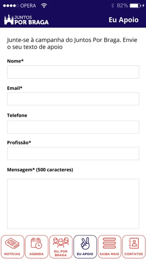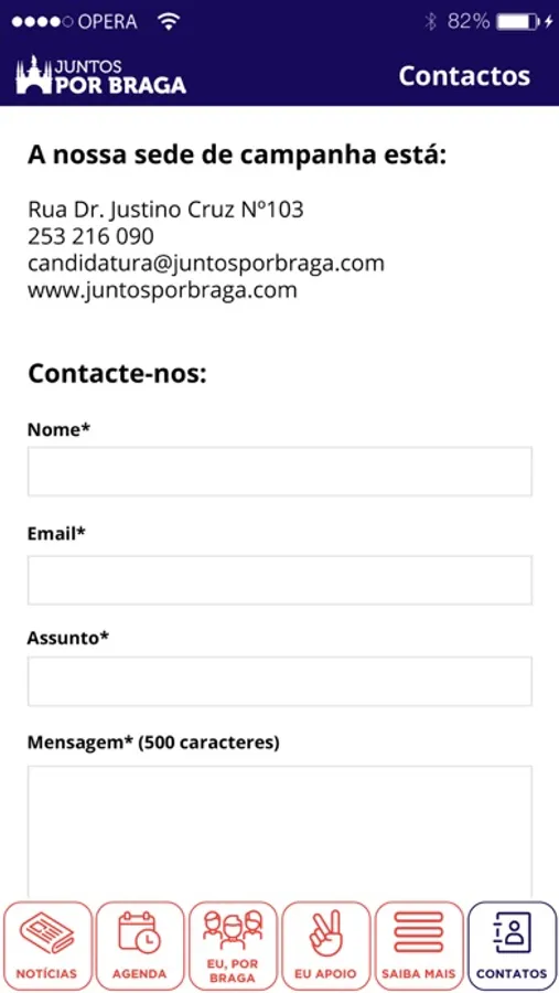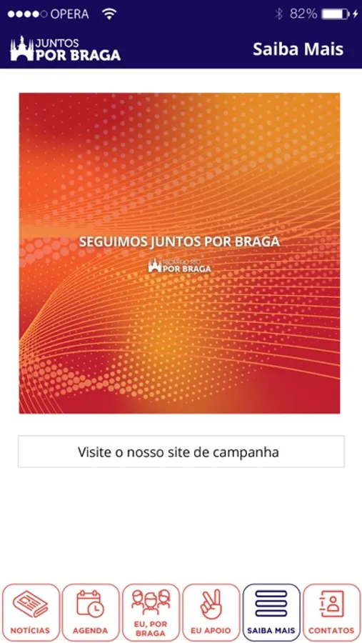 A aplicação da Coligação Juntos Por Braga permite ao utilizador ter acesso às noticias e aos eventos de campanha da Coligação e de uma forma fácil enviar o seu apoio à Coligação, registar-se para ser voluntário durante a campanha e solicitar informações através do formulário de contacto.
