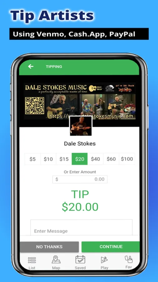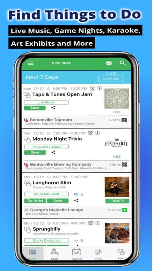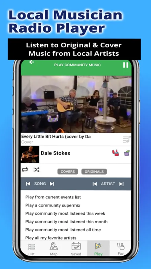 Find local events, and get to know your local artists better by listening to their cover and original music on the Stages.Live local musician radio player. Follow your favorite artists and venues. Tip artists through the app using Venmo, Cash App or a credit card.