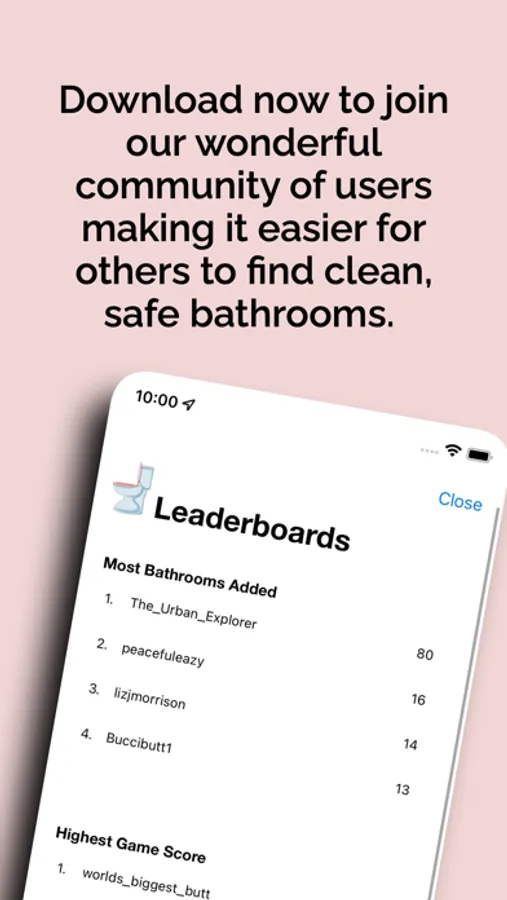 Our leaderboards section shows users who go above and beyond, adding, reviewing, and rating bathrooms. Check it out!