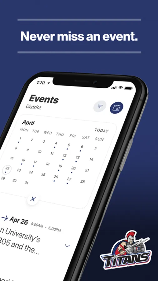 The event section shows a list of events throughout the district. Users can add an event to your calendar to share the event with friends and family with one tap.