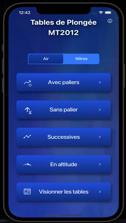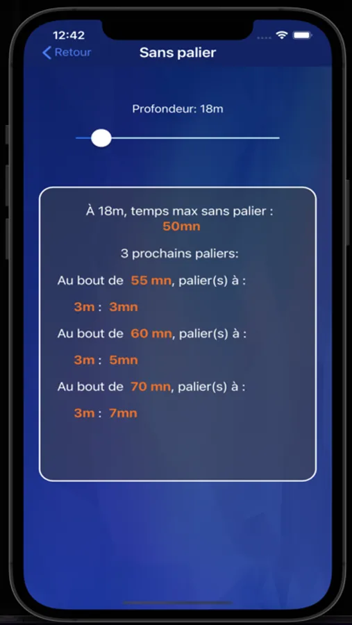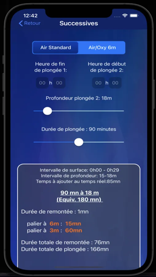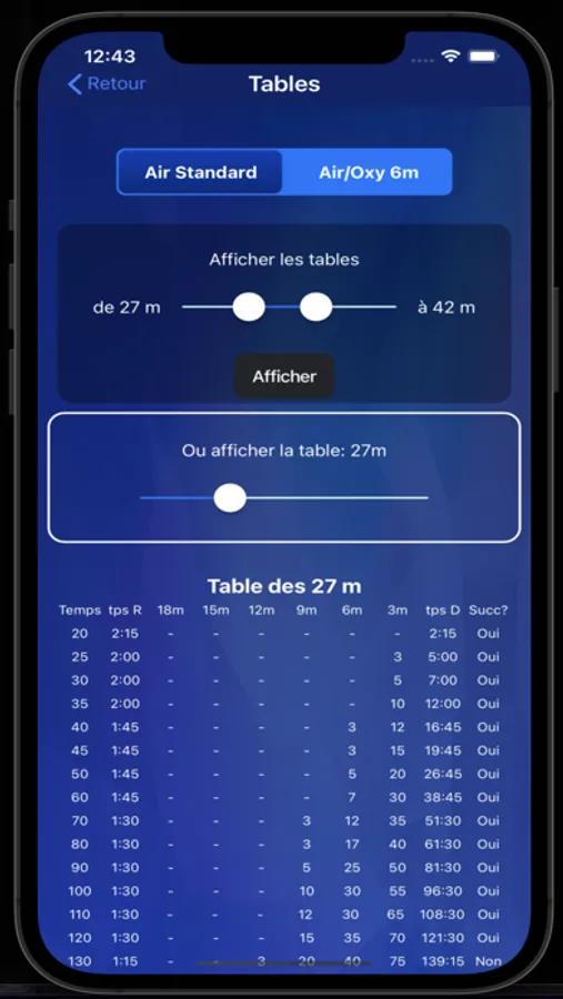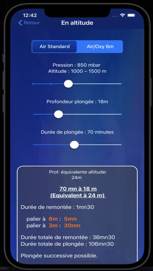 Calculateur de temps de plongée. Cette application permet de vous aider à calculer les temps de plongée plus rapidement en se basant sur les tables MT2012 air/standard et Air/Oxy 6m. Cette application est un extrait du décret relatif à la protection des travailleurs intervenant en milieu hyperbare. Elle n'est pas destinée à être utilisée seule afin de calculer les paliers de décompression et ne substitue pas au décret précédemment cité.