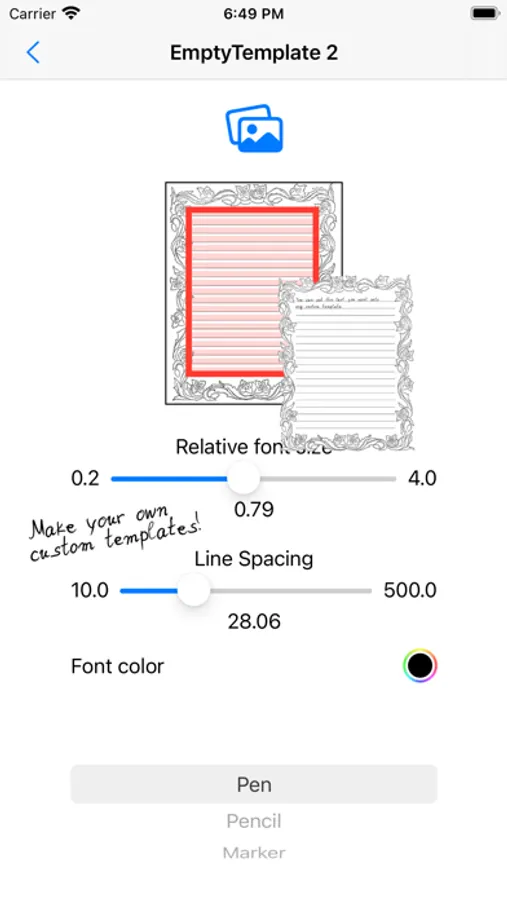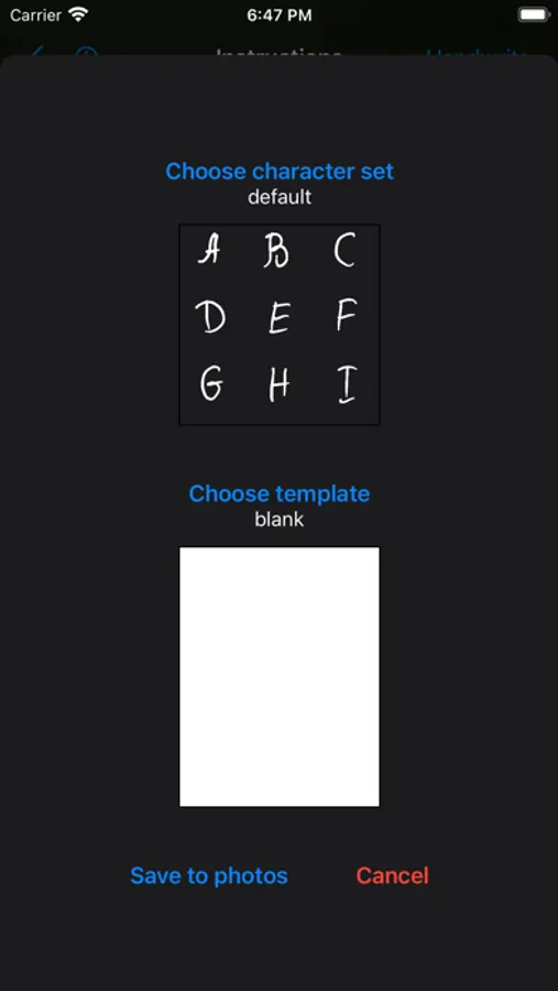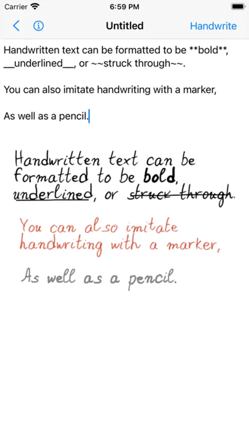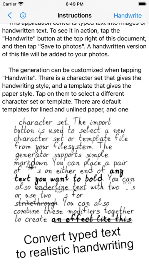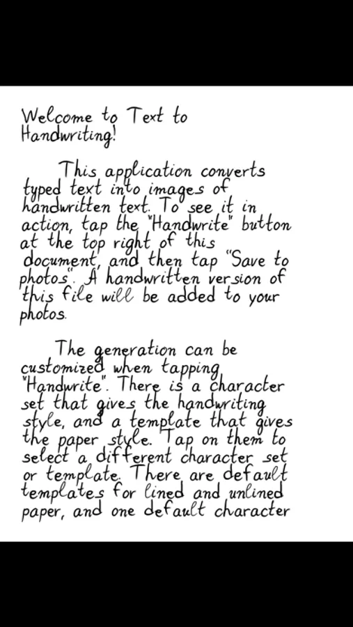 Turn any typed text into a picture of handwritten text with the push of a button. Select from a number of preset paper backgrounds or create your own from the Photo Library. Use the default handwriting style or make your own by writing each character yourself. Write multiple instances of characters for more convincing handwriting.