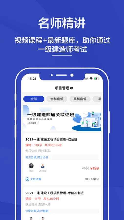 名师精讲,视频课程,适用于全国2021一级建造师资格证一建考试用户,一级建造师收录建设部二建执业资格证考试全部题库;