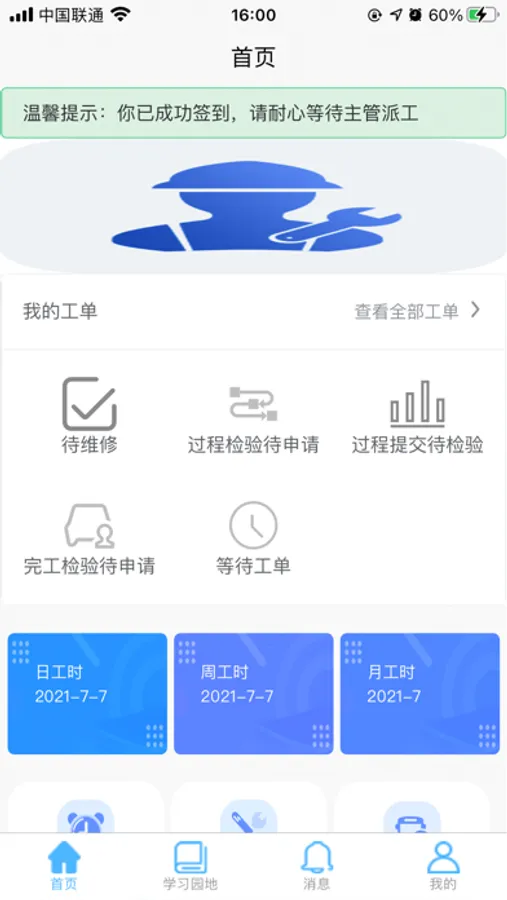 工时查看,工单查看,申领工具,学习维修技能和安全知识,为维修工提供便于操作、易于查询