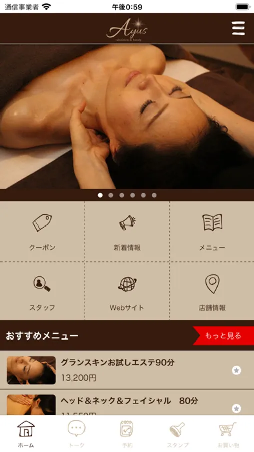 【relaxation&beauty Ayus】の公式アプリが登場。アプリを通して【relaxation&beauty Ayus】の新着情報やお得な情報をリアルタイムで受け取ることができます。また、いつでもお手元のスマートフォンから、メニューやご希望のお時間帯のチェック・ご予約などが可能です。アプリをインストールしていただくことにより【relaxation&beauty Ayus】を、より便利に身近にご利用していただけます。