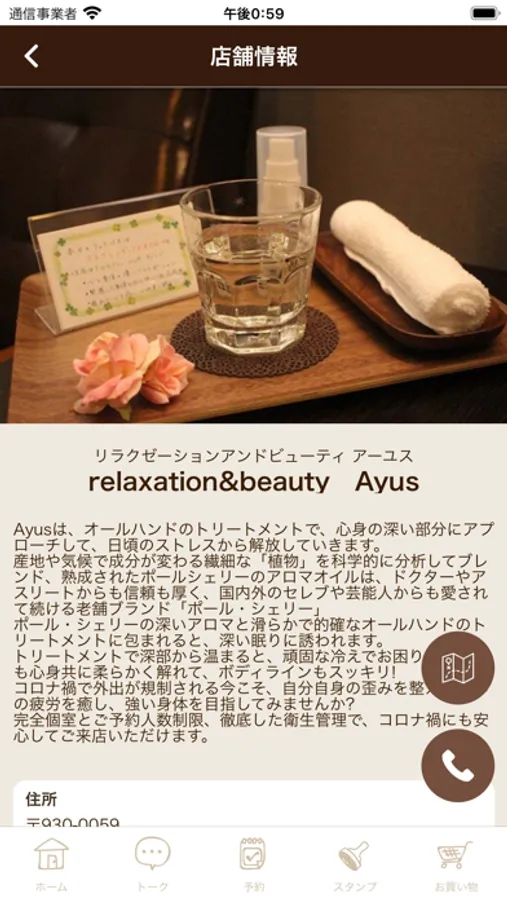店舗のマップが表示され、地図アプリとも連携しているので、初めてのご来店の時も簡単に見つけることができます。