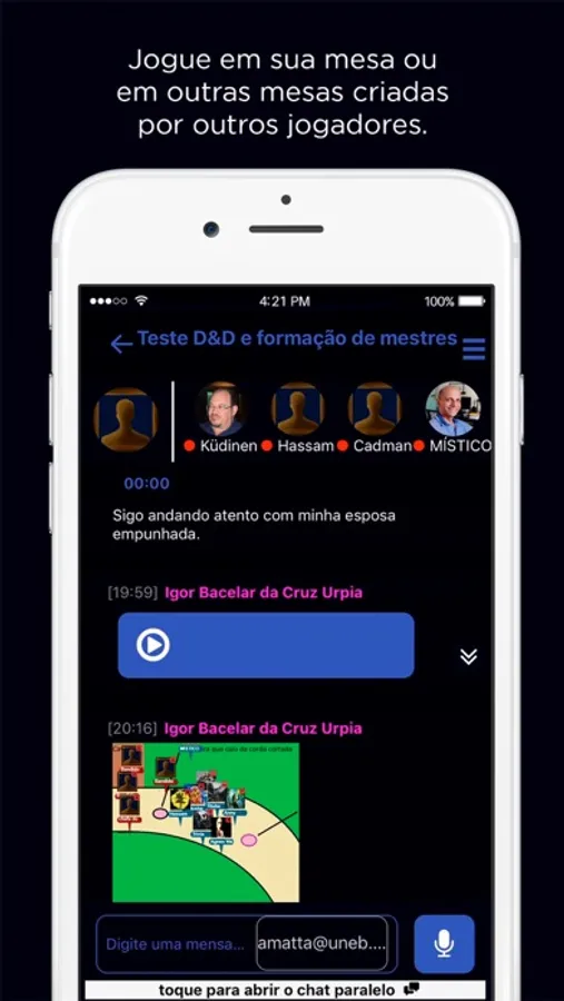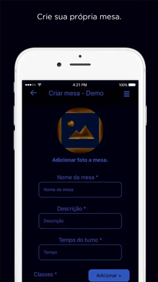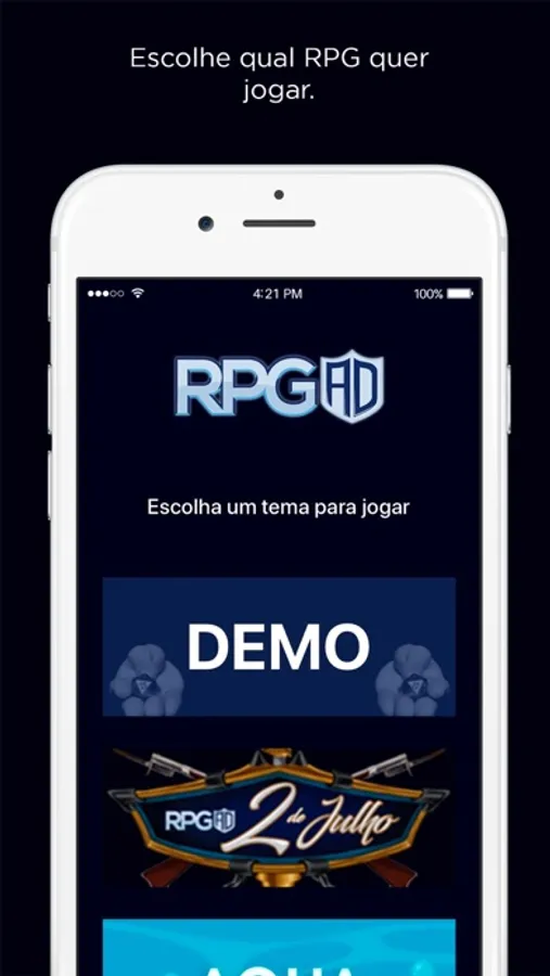 Neste aplicativo, o jogador é convidado a escolher um ou mais dos treze temas disponíveis, se cadastrar, criar uma mesa para ser mestre, ou jogar como personagem de uma mesa criada por outro mestre.