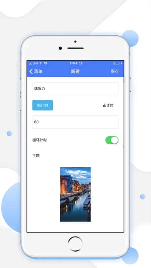 定制个性化目标内容,根据需要设置时间及计时方式,添加主题图片为自己加油打气。