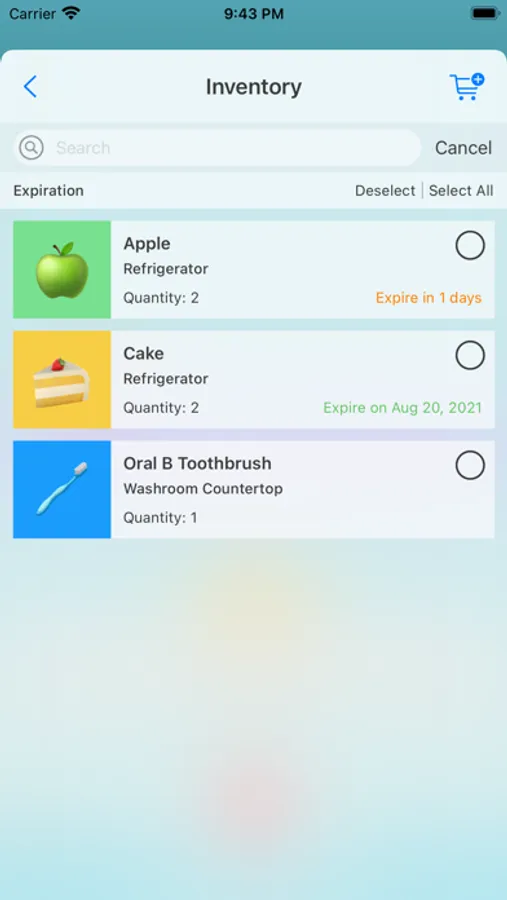 • Select any items in inventory to create shopping list.