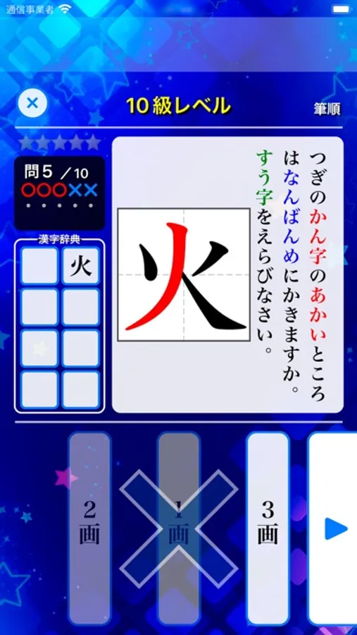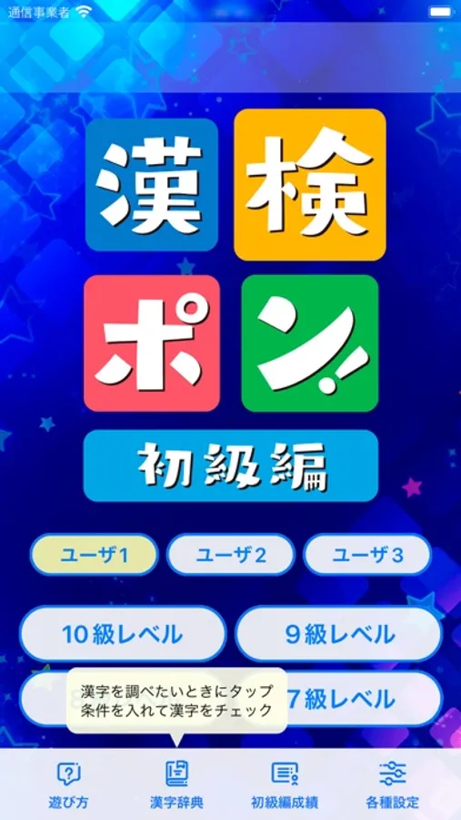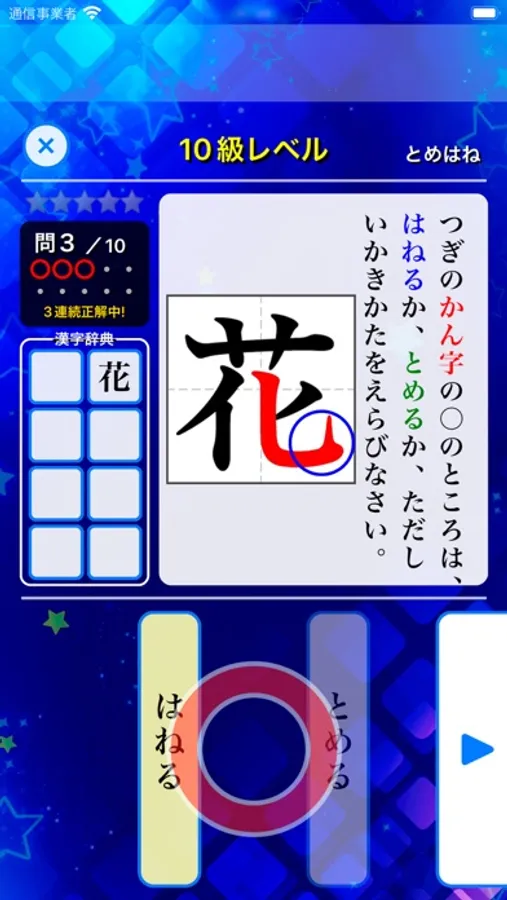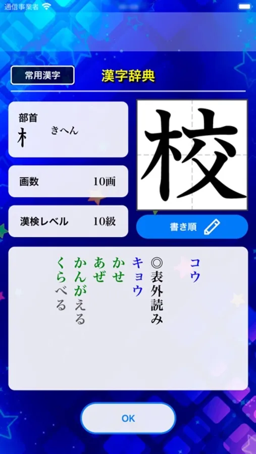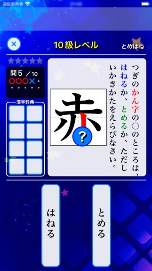 ちょこっと便利な簡易漢字辞典機能付きで、ゲーム中いつでも部首、漢検レベル、読みや書き順(常用漢字のみ)が確認できます。