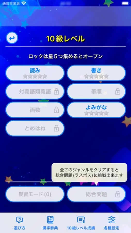 各レベルごとにも正解率や達成率など成績が記録され、間違えた問題も『復習モード』でおさらいできる。