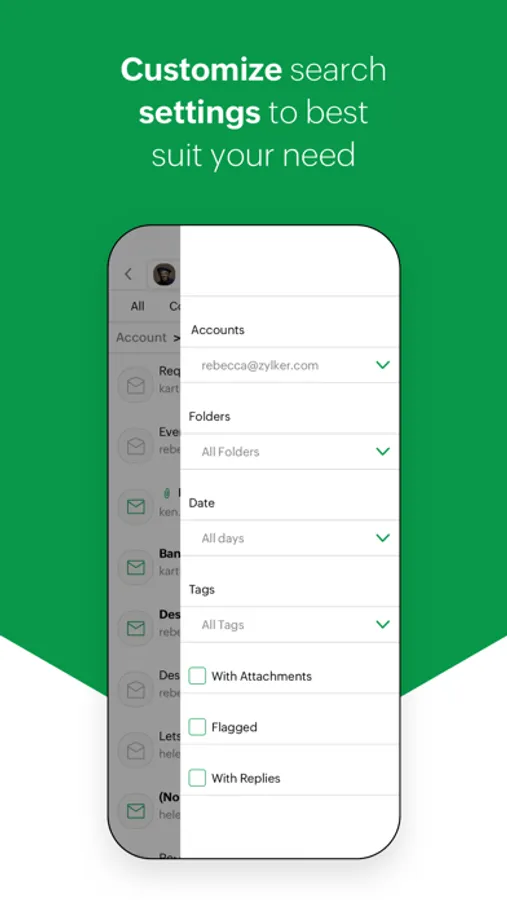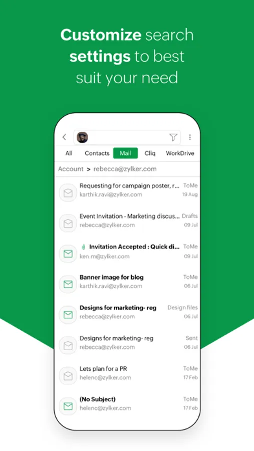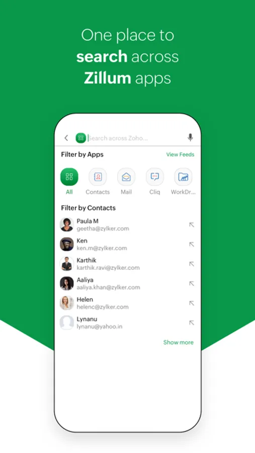 - Comprehensive and organized search: The search bar searches for a keyword across all Zillum apps, with results filtered by specific contacts and by individual apps. Find exactly what you're looking for with minimal effort and further narrow down the results with fine filters.