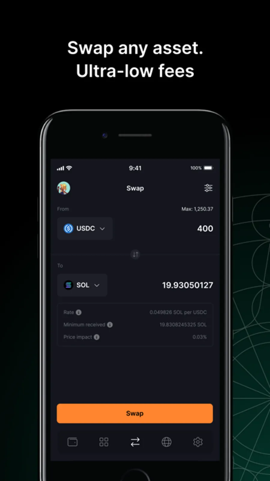 Solflare offers an easy-to-use swap feature that lets you instantly swap any SPL asset with a single tap.