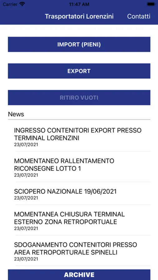 Terminal Lorenzini (Livorno)'s app for logistic coordination. Allows to receive real time notifications on the terminal operativity, read the latest news and check the container position and availability. The "Contacts" section ease the communication with the terminal office to quickly obtain the desired infos. It's integrated with the Maps service to check the position and to navigate toward the destination