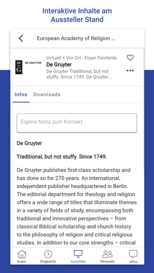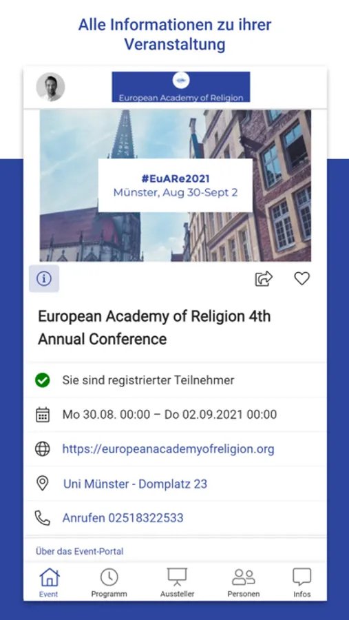 The European Academy of Religion is holding its 4th Annual Conference in Münster (Germany) from August 30th until September 2nd this year. The conference will take place as a hybrid event and offer the possibility for participation online and on-site. This App will help you accessing the panels, keynote lectures and discussions in an easy way and support you in creating your individual conference schedule as well as giving you the opportunity to get in contact with other participants.