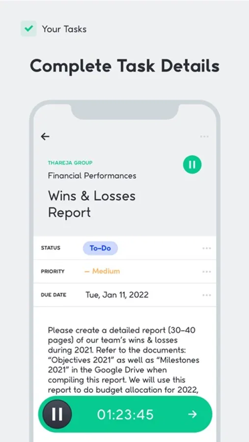 Open Thareja Time Tracker, select the project & task you’re working on and tap Start. The tracker will keep running in the background along with recording time and location. Whenever you need a break or are just done with the work, press Stop. That’s all it requires.