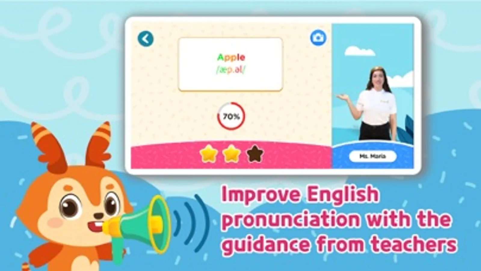 Applying artificial intelligence and exclusive pronunciation recognition technology, children will be guided by a team of experts & native teachers to pronounce words through the camera. Our technology will identify and evaluate the child's pronunciation and point out detailed errors, helping them to adjust & pronounce correctly from their early ages.