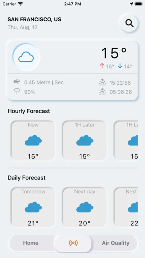 It provides current temperature in Celsius, sunrise and sunset time according to city time zone. Moreover, the weather app also displays weather conditions, relative humidity, wind speed and direction, weather alert, advises for activities, air quality index alert, in addition to 7 days in future and hourly weather forecast.