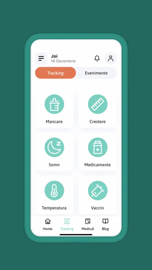 - Jurnal al sanatatii copilului tau: ai posibilitatea de a inregistra medicamente, vitamine, temperatura sau lista de vaccinuri administrate si seta alerte si notificari pentru oricare dintre acestea